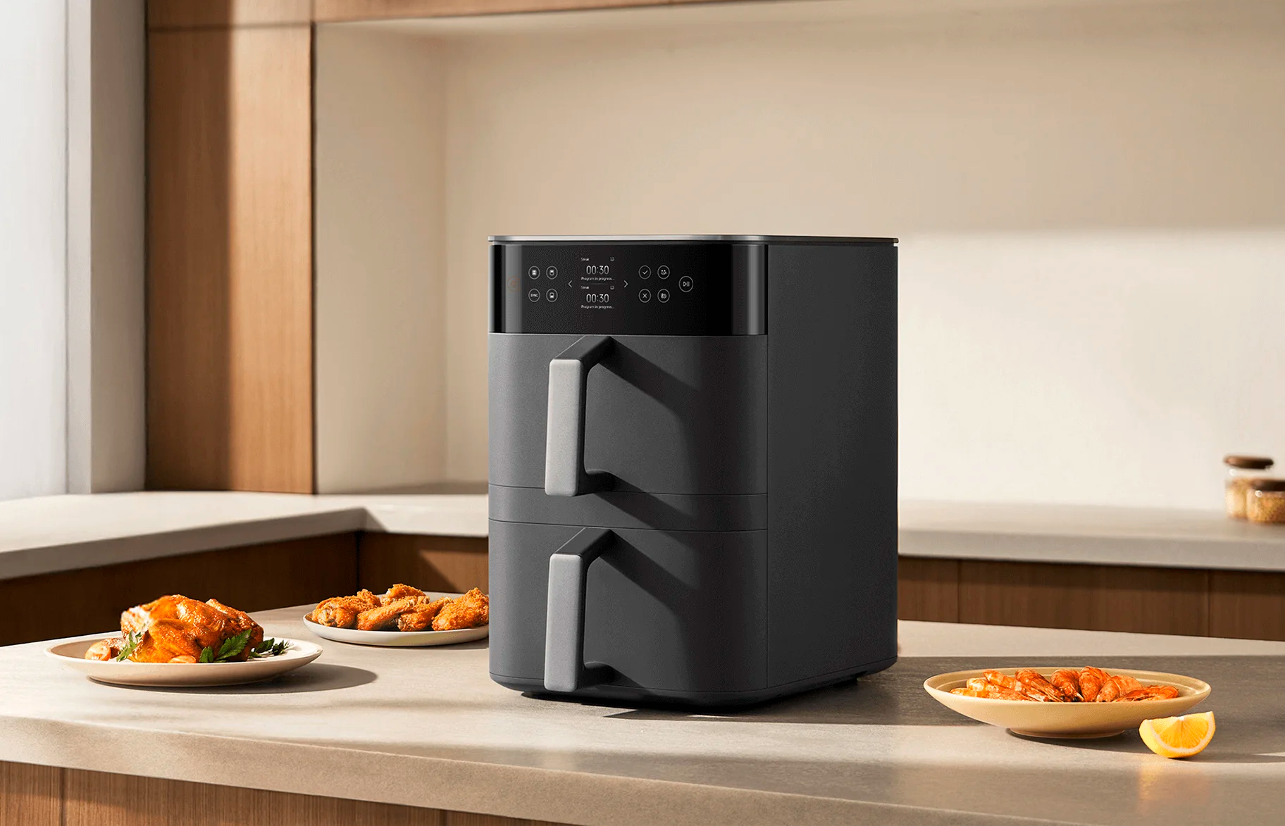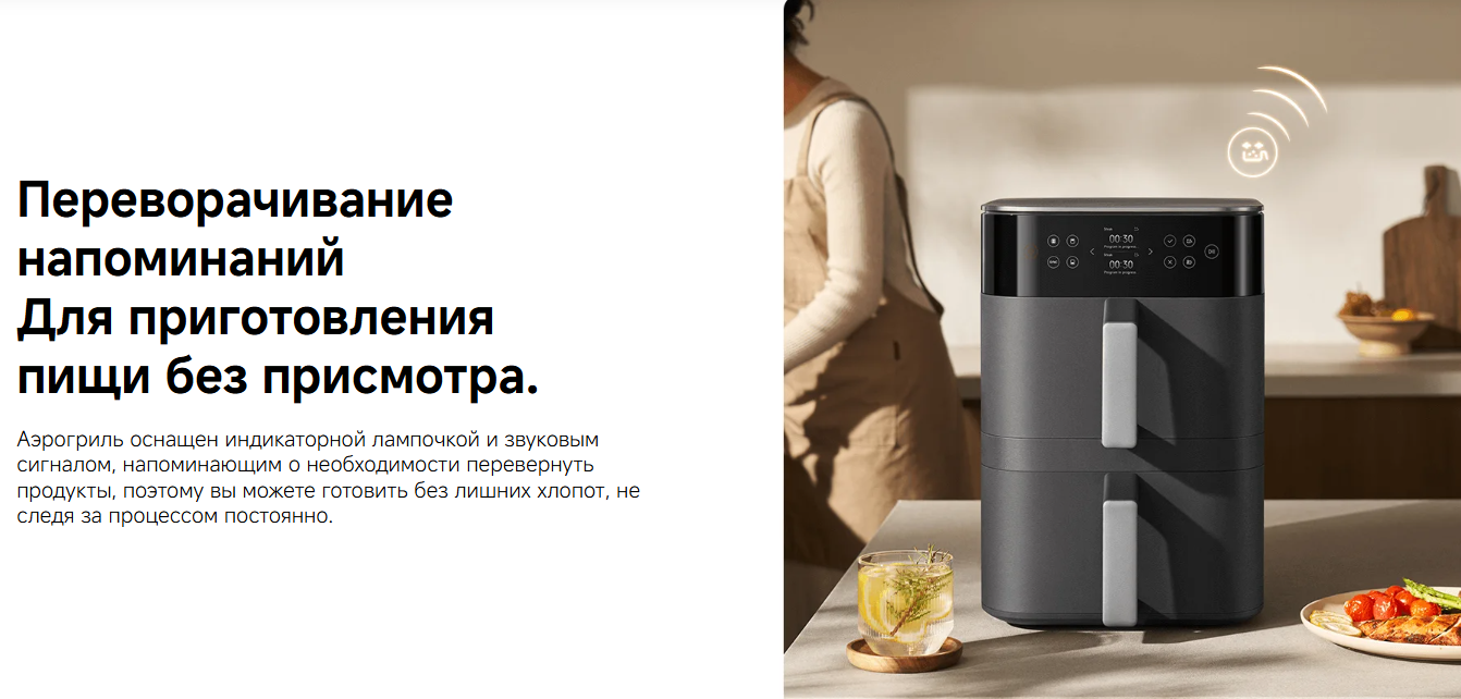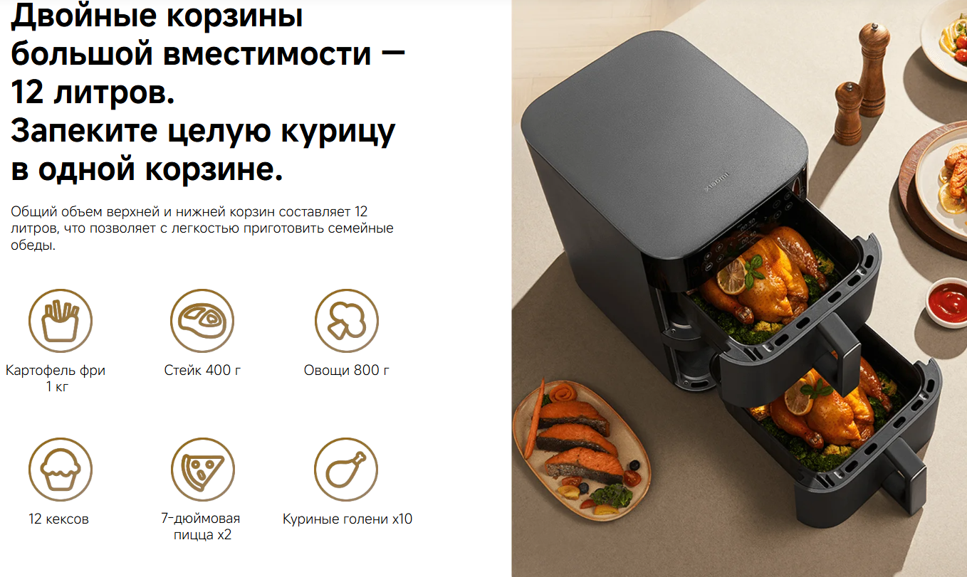 Xiaomi Smart Double Stack Air Fryer — вместительная аэрофритюрница с двумя корзинами и общим объемом 12 литров. Подходит для приготовления блюд на большую семью или для одновременной готовки разных продуктов.