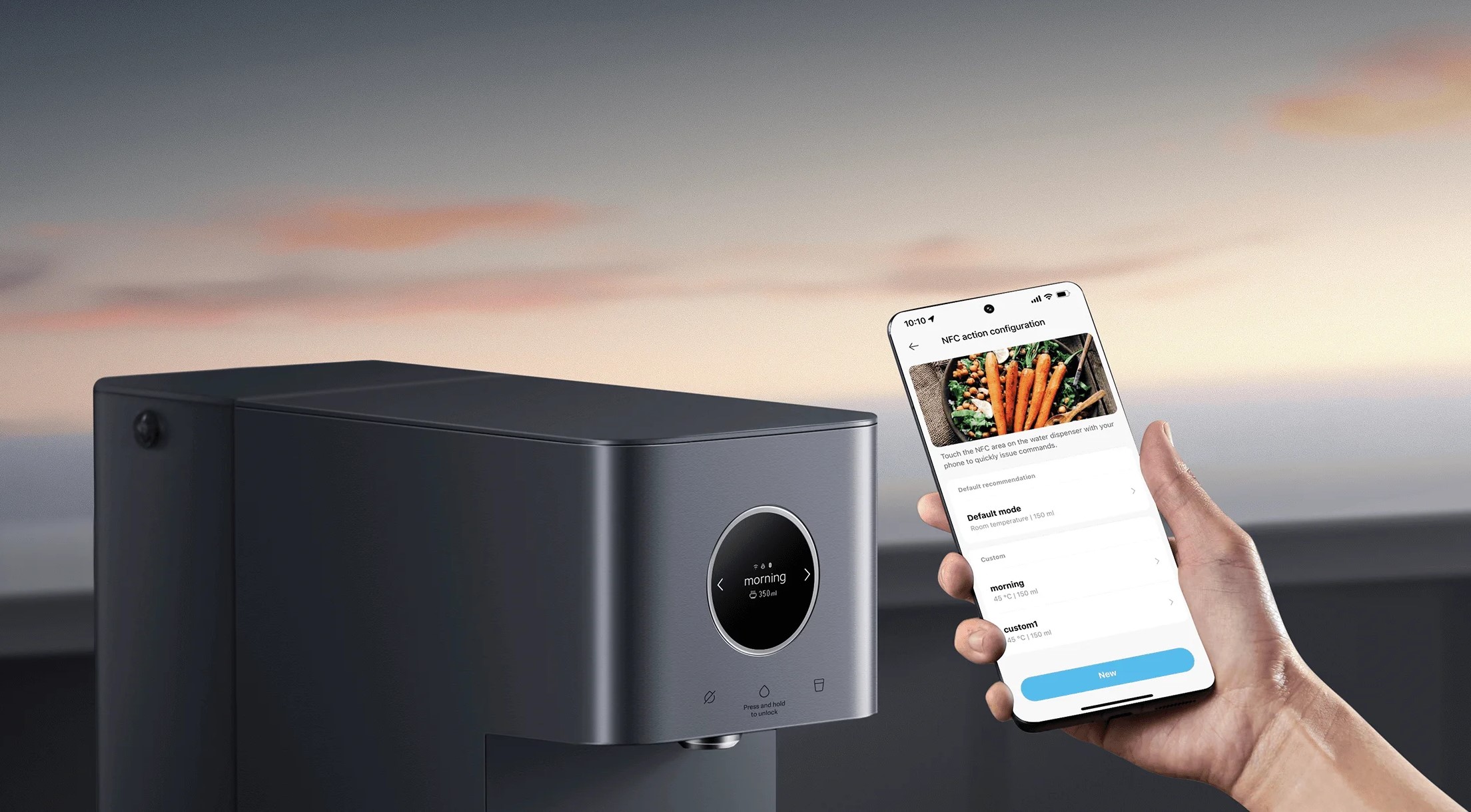 Настройте свой эксклюзивный питьевой профиль, связав прилагаемую изолированную бутылку для воды Xiaomi NFC с приложением Mi Home/Xiaomi Home. Вода сразу же подается, когда вы помещаете бутылку в поддон для сбора капель.